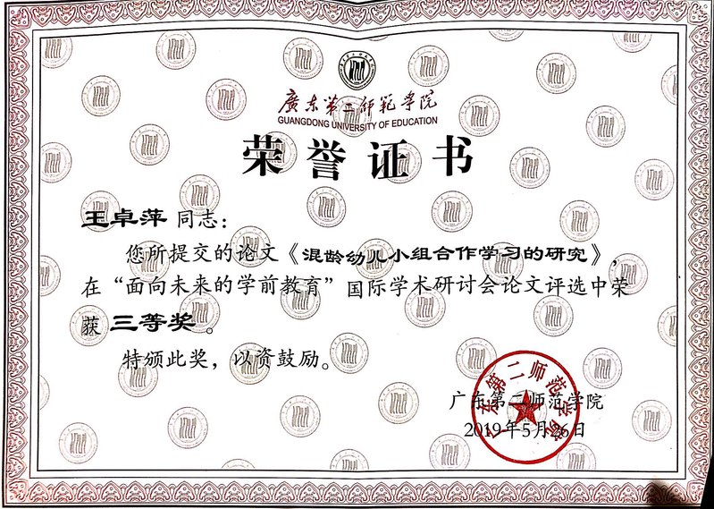 会议收到国内外参会论文近90篇,经专家组评选,评出特别奖3名,一等奖5名,二等奖10名,三等奖20名,其中我院王卓萍同学提交的论文《混龄幼儿小组合作学习的研究》在“面向未来的学前教育”国际学术研讨会论文评选中荣获三等奖。