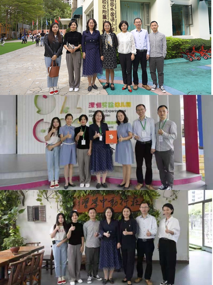 11月17日,检查组走访了荔园外国语小学东校区附属幼儿园、深圳实验幼儿园、深圳教育幼儿园。在荔园外国语小学东校区附属幼儿园,钱园长向大家介绍了幼儿园为四位实习生制定的实习计划,四位实习生逐一发表了自己在幼儿园两周的体会,在她们的发言中感受到了园领导对她们在生活中的关怀照顾,班级主班老师在工作中对她们的悉心指导。走访的第二所幼儿园是深圳实验幼儿园,幼儿园丰富的环境创设和设施设备处处体现着让儿童自主探索,用儿童的一百种语言去表达他们的内心。杨副园长向学院领导和老师介绍了幼儿园的发展历史以及“三人行”课程。在后续的交流中,杨副园长强调了实习的重要性,实习与见习的区别就在于要去实操,要去大胆地尝试,积极地融入到幼儿园的工作和生活当中,而不要去做一个“旁观者”。下午,检查组走访了深圳教育幼儿园。幼儿园“在行动中学习”的教育理念,以及“学习中心走班”课程模式,在广东省的园所中都是首屈一指。幼儿园的王园长作为第八届广东省本科高校师范生教学技能大赛学前教育组的评委,在闭幕式上就提到了要注重本科生创造性思维的发展。在这次实习检查交流中,王园长依旧强调了这一点,幼儿园教师应该不断去学习新的理念、新的技能,将自己的专长发挥出来。四位实习生在短短两周的实习过程中也收获满满,通过观察与实践努力将理论知识与实际应用连接起来。