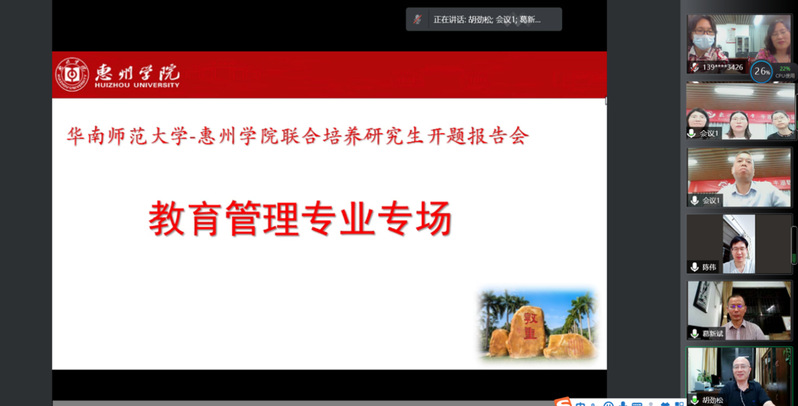 2021年6月10日晚上,华南师范大学—惠州学院联合培养研究生开题报告会(教育管理专业专场)采用线上腾讯会议和线下(旭日楼621)指导方式进行。华南师范大学教育科学学院院长胡劲松、副院长葛新斌、惠州学院发展规划处处长欧小军、教育科学学院院长陈伟、副院长谢桂新、胡娇老师等出席报告会,会议由陈伟院长主持。