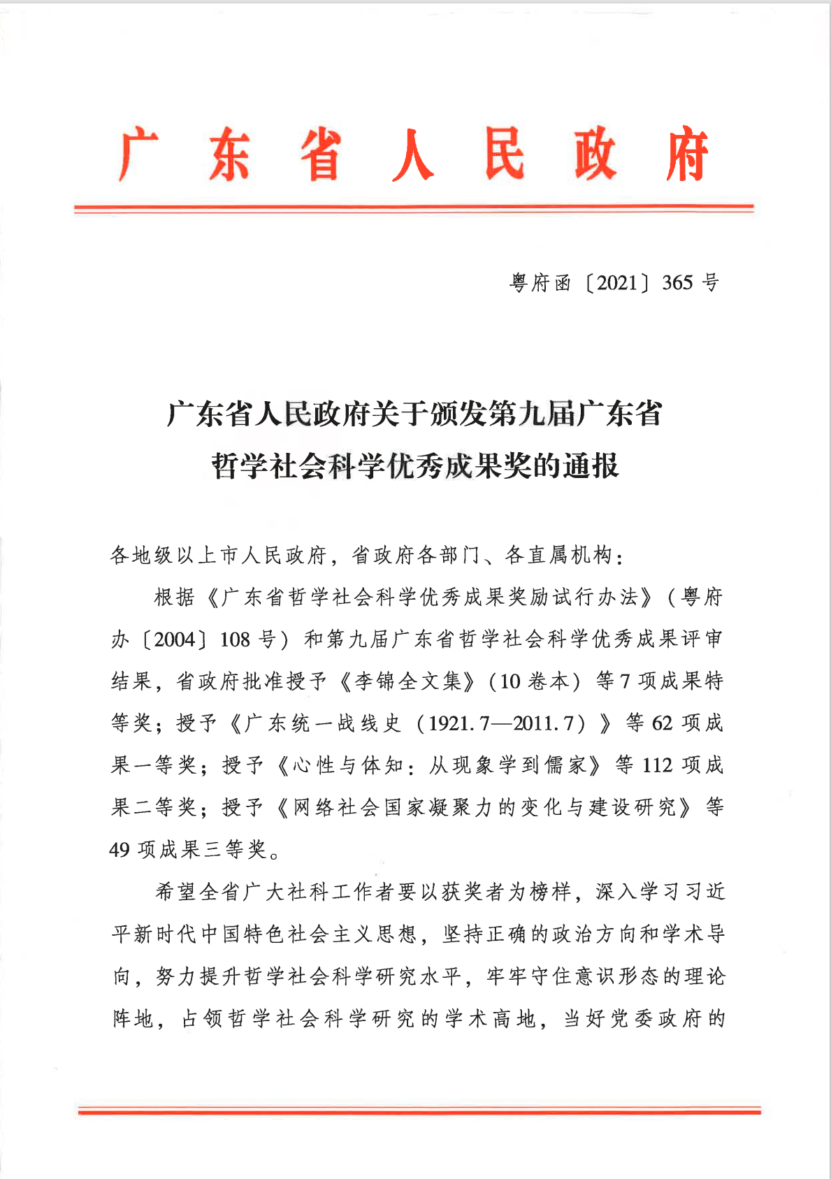 1217日,广东省人民政府公布了《颁发第九届广东省哲学社会科学优秀成果奖的通报》文件,我校教育科学学院院长陈伟教授的研究成果《中国高等教育的历史方位:分析维度和变迁趋势》荣获广东省哲学社会科学优秀成果奖二等奖。