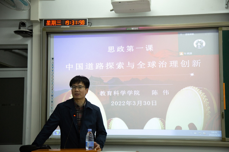 2022年3月30日晚,教育科学学院院长陈伟为同学们讲授思政第一课,陈伟院长以“中国道路探索与全球治理创新”为主题进行讲授,基于中国特色,探索中国道路,鼓励广大学子坚定坚定道路自信、理论自信、制度自信、文化自信。