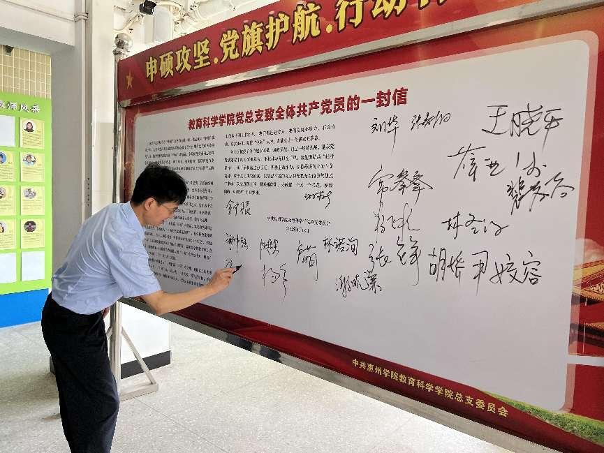 最后,全体党员进行了签名活动,在《教育科学学院党总支致全体共产党员的一封信》宣传栏的空白处,庄重的把自己名字写上,表明了勇于承担责任,积极主动作为,使我们的“申硕梦”早日梦圆的决心。