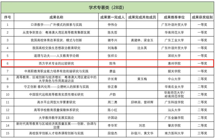 我院陈伟教授的专著《西方学术专业的比较研究》获“广东省高等教育学会第二届高等教育研究优秀成果奖”学术专著类一等奖。