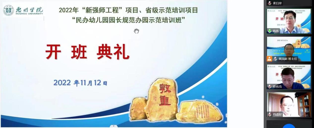 11月12日上午,2022年民办幼儿园园长规范化办园示范培训班惠州学院班开班典礼腾讯会议举行。教育科学学院院长陈伟、继续教育学院副院长邓伟浩、教育科学学院副院长肖崇好、教育科学学院学前教育系主任黄国庭、教育科学学院教师麦日岸以及民办幼儿园园长规范化办园示范培训班全体学员参加了典礼开班典礼由肖崇好主持