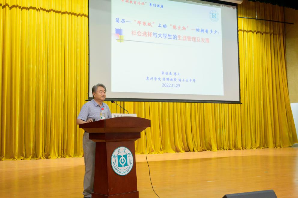 11月29日晚上,教育科学学院在鹅城会议厅举办了“丰湖教育论坛”讲座。惠州学院特聘教授、博士生导师张桂春教授为教育科学学院2020级全体同学作了《简历“那张纸”上的“填充物”你拥有多少——论社会选择与大学生的生涯管理及发展》主题讲座。讲座由学院党总支书记谢伟强主持,副书记刘华、辅导员张磊及2020级全体同学参加了此次讲座。