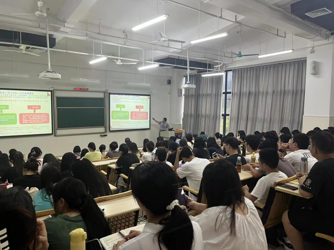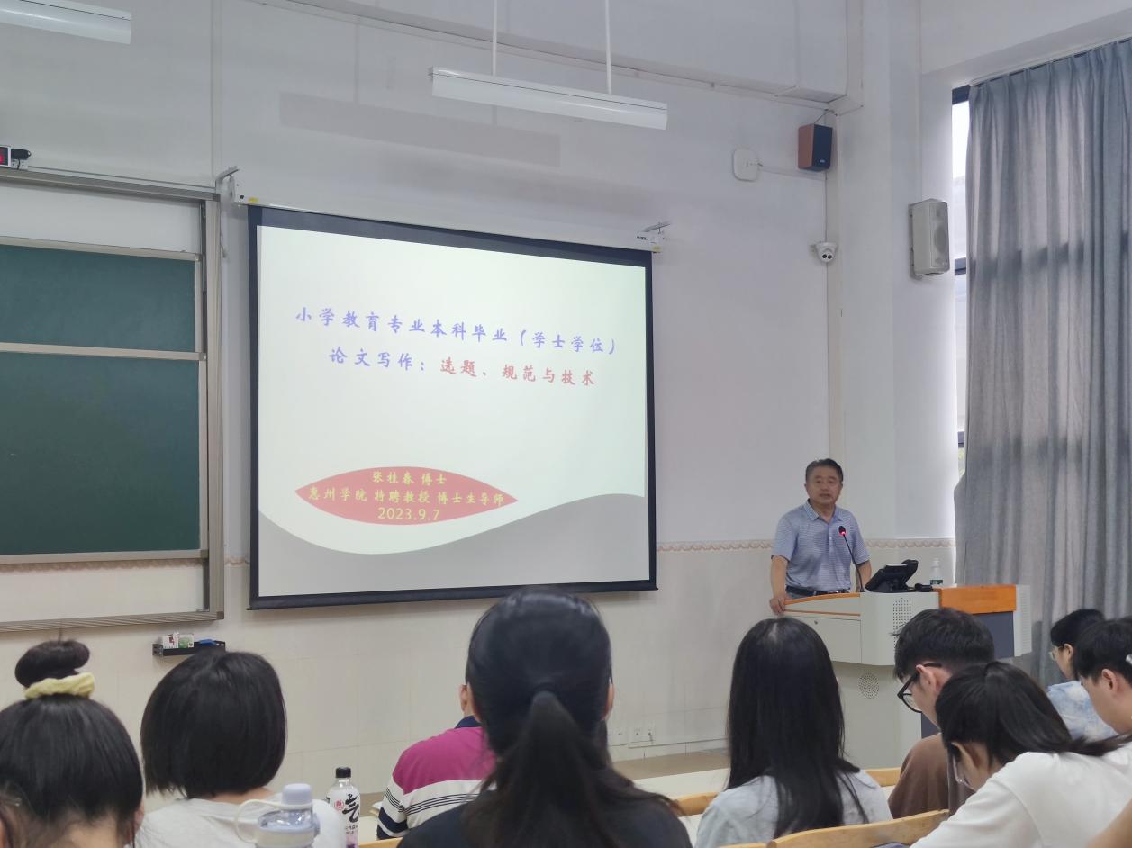 2023年9月7日下午,惠州学院特聘教授、博士生导师张桂春教授在旭日科技大楼B座107教室开展了关于小学教育专业本科毕业(学士学位)论文写作:选题、规范与技术的专题讲座。教育科学学院副院长肖崇好出席并本次讲座,2020级小学教育专业全体同学参加。