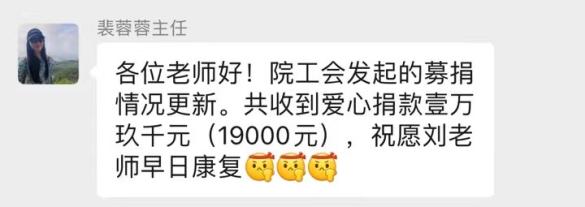 2023年9月初,我院刘爱平老师感到身体不适,到医院进行检查后被确诊为乙状结肠恶性肿瘤,整个治疗期间需要花费一大笔治疗与手术费费用。在得知此消息后,院领导、学院分工会非常重视,结合刘老师家庭经济确实困难的实际情况,马上采取向学校工会申请给予支持帮助的情况后,于2023年9月14日向学院全体教职工发出了“爱心捐款倡议书”,并得到了积极响应。全体教职工纷纷伸出援助之手,积极参加本次捐款活动。点点爱心,汇聚成河,无私助人,温暖真情。目前已募捐到人民币19000元的爱心捐款。