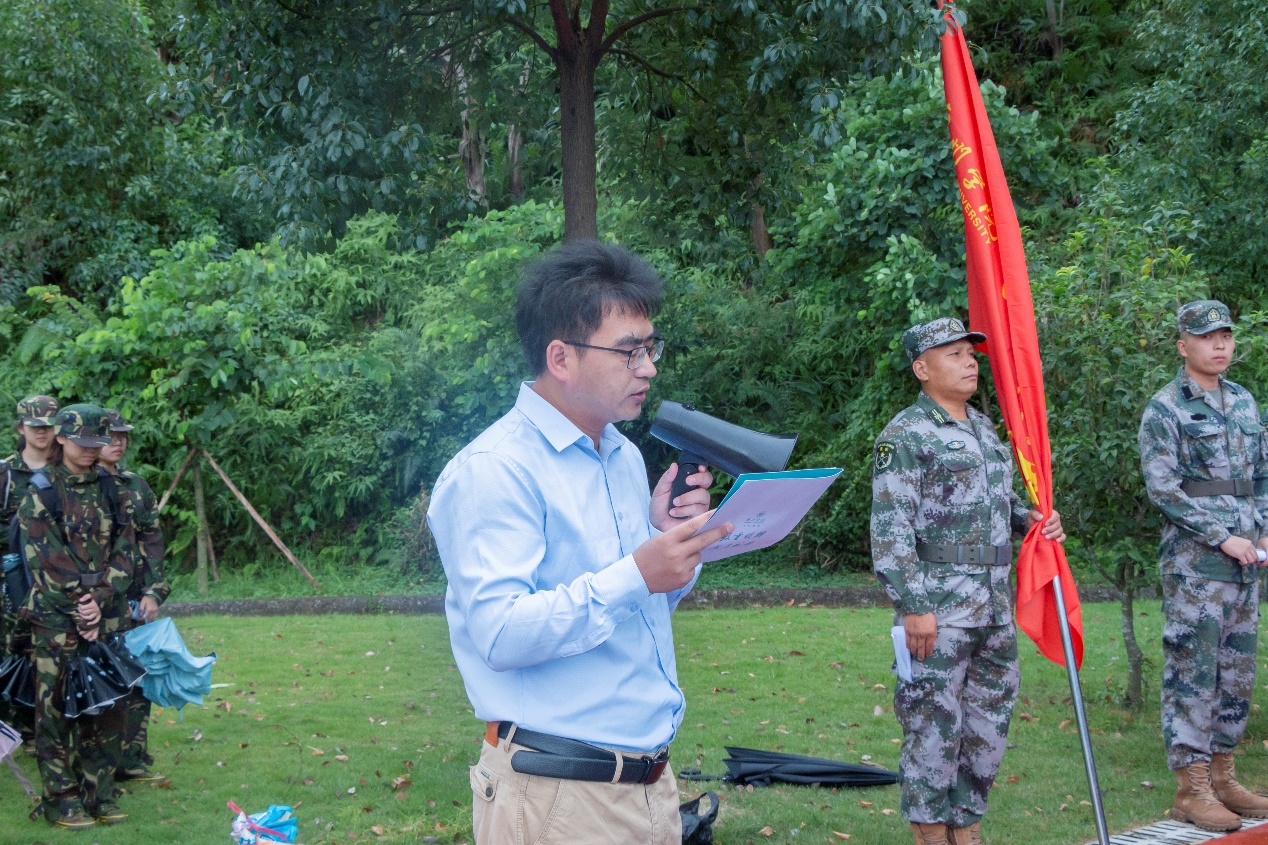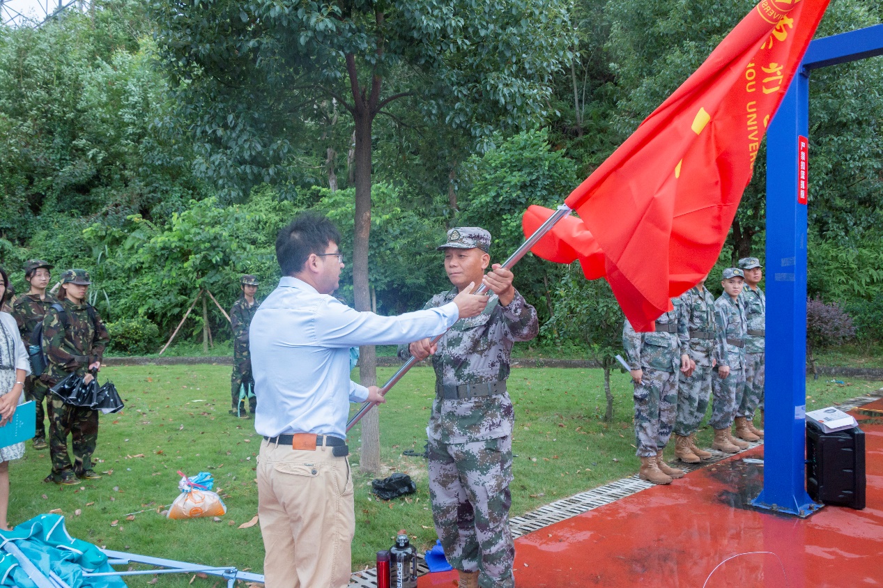 首先,辅导员老师向学院参训学生介绍此次开营仪式的领导、班主任及教官们。随后,刘华副书记作开训动员讲话。他强调,开展大学生军训,是贯彻落实习近平新时代中国特色社会主义思想和强军思想,全面贯彻党的教育方针、新时代军事战略方针和总体国家安全观的需要。同时,也对学生们提出了几点希望:第一,要耐得辛苦,不怕苦不怕累,认真对待军训。第二,一切行动听指挥,要做到服从命令,严守纪律,争当标兵。第三,要发扬集体主义精神和爱国主义精神。第四,在军训中,各排要及时做好宣传报道工作,尤其是在军训中涌现出来的好人好事,要多加表扬、激励,鞭策后进,鼓舞士气,为营造良好的班风、学风打下坚实基础。随后,刘华副书记向十七连连长授旗,将训练新生、磨练意志的重任交给了连长。