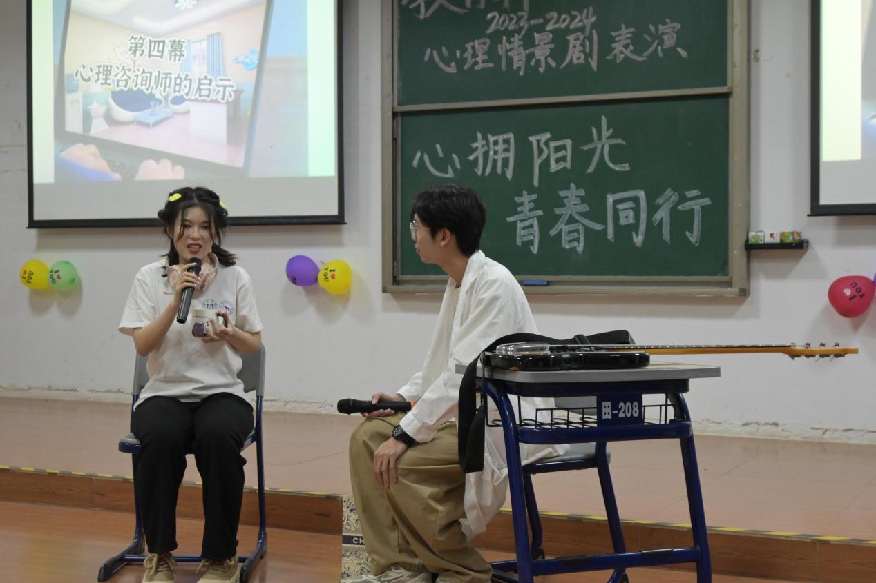 由何瑞琪等同学带来的心理剧《人生没那么多看客》拉开了比赛的序幕。人生,是一部跌宕起伏的戏剧,我们每个人都是其中的主角,但往往有许多人太过在意他人的眼光与评价,最终变得唯唯诺诺、畏手畏脚。在同学们精彩绝伦的表演下,现场观众受益匪浅,懂得了在人生的大舞台上本没有那么多看客关注我们,我们要放下包袱,勇敢做自己的道理。