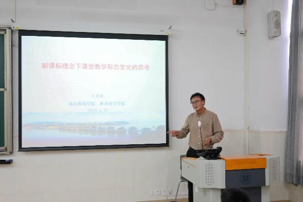 329日下午,韩山师范学院党委委员、广东省“百千万工程”小学理科名教师培养项目负责人及首席专家、广东省首届中小学教师培训专家工作室负责人王贵林教授应邀来我院,开展“新课标理念下的课堂教学形态变化的思考”的主题讲座。讲座由王贤文副院长主持,2023小学教育12全体同学和部分教师参加