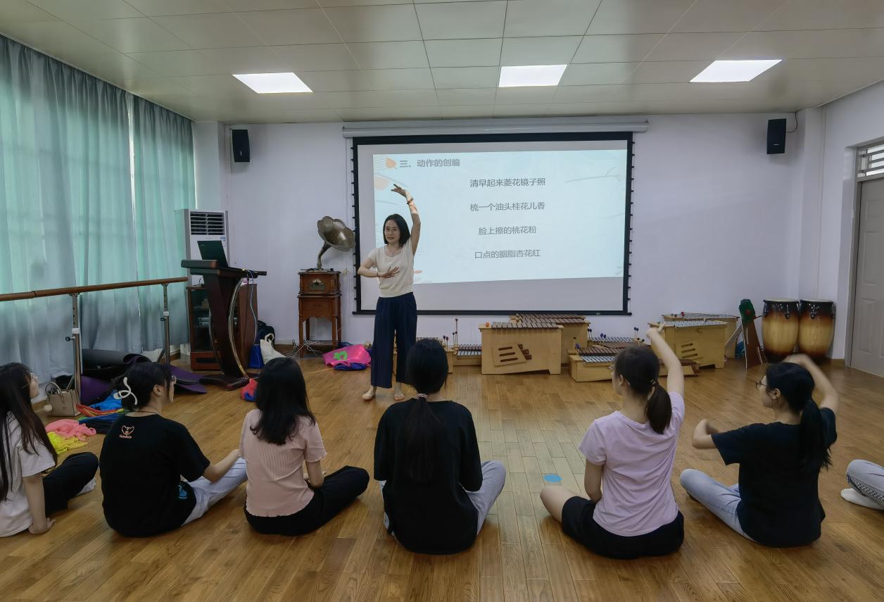 罗阳燕老师在奥尔夫律动与幼儿集体舞编排方面有着丰富的教学经验,其编排的幼儿舞蹈多次获得省级、市级一等奖。她向同学们详细讲解的幼儿舞蹈编排相关专业知识,例如编舞题材、音乐选取、动作创编等,让同学们对于律动和舞蹈在奥尔夫音乐课堂中的运用有了更深刻的理解与体会。
