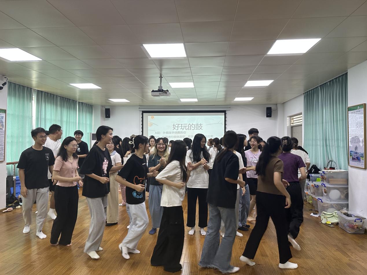 本次嵌入式教学主要从奥尔夫律动活动、奥尔夫集体舞活动、幼儿集体舞编排三个方面进行展开。首先,罗阳燕老师向学生系统的介绍了奥尔夫律动和幼儿园集体舞的概念及形式,并通过分析实际教学案例向同学们传授了编排基础幼儿舞蹈的方法及基本原则。在课堂游戏“好玩的鼓”中,罗老师通过分组合作、角色扮演的方式,引导同学们跟随音乐进行律动,同学们在活动中不仅感受到了奥尔夫音乐课堂的乐趣和意义,同时学会了如何将肢体律动与音乐、节奏相结合来进行奥尔夫音乐律动的编排。