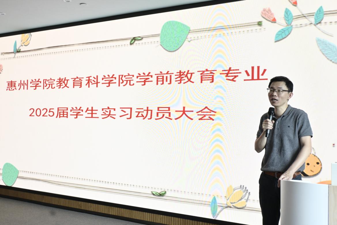 会议初始,由谢桂新副院长为本次大会发表动员讲话。谢院长提到我们学过许多的课程,但实习是其中一个很重要的课程。谢院长鼓励同学们在实习中赋能,在实习中研习,在实习中择业。坚持不怕苦、不怕累的精神,在了解幼儿园办园理念与特色的基础上学习保育和教育的本领,锻炼能力、勇于承担、乐于学习,积极面对实习生活,在实习中展现学前教育学生的优秀面貌。