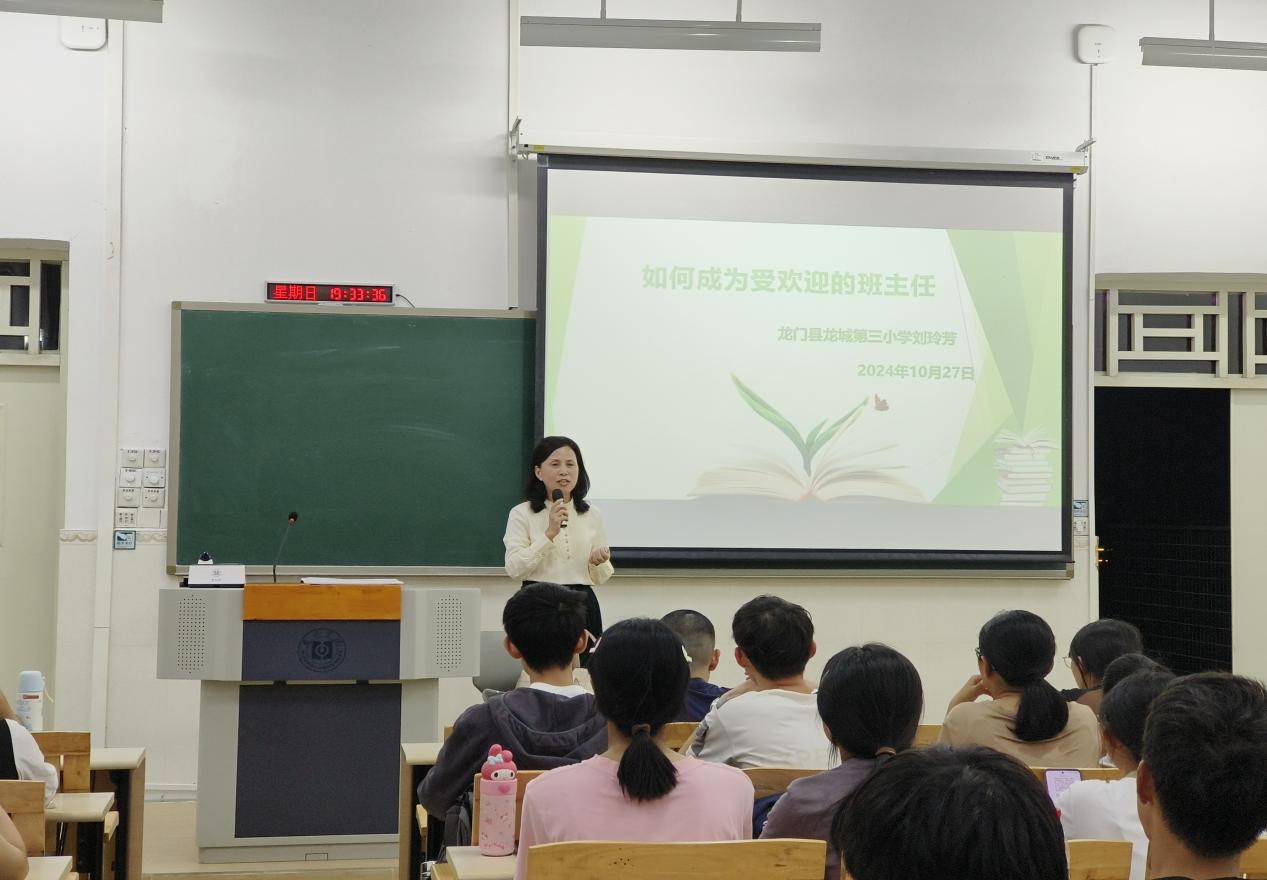 为了进一步增进小学教育专业学生对于班主任和班级管理的理解和认识,为职前教师们提供切实可行的班级管理指导和建议,帮助他们在未来的教育生涯中更好地承担起班主任这一关键角色,10月27日晚,惠州市龙门县龙城第三小学刘玲芳书记应邀来我校旭日科技大楼B座104 教室开展“如何成为受欢迎的班主任”专题讲座。本次讲座由小学教育系主任张铮老师主持,教育科学学院小学教育卓越班同学及其他感兴趣师生一百余人参与了此次讲座。