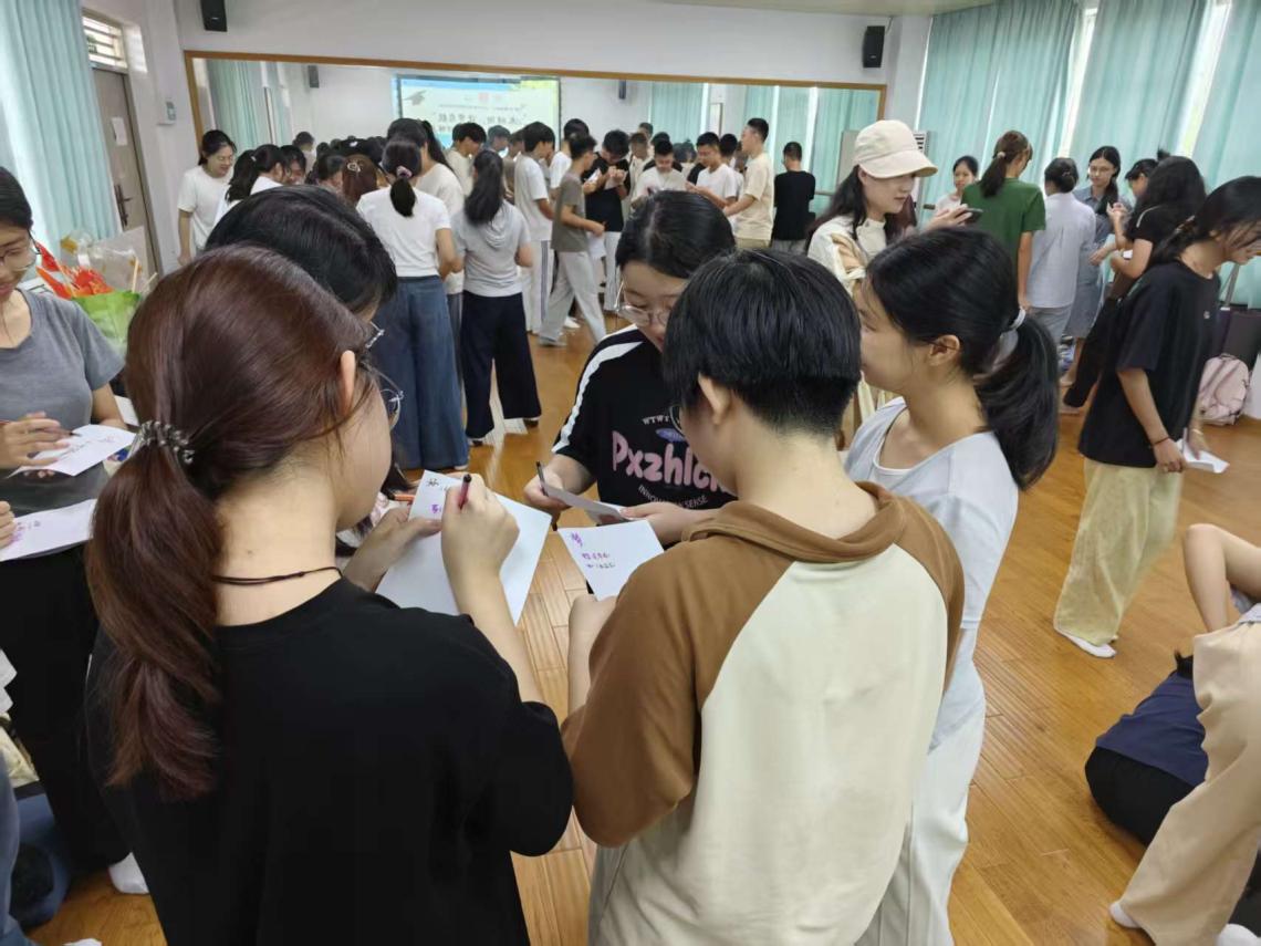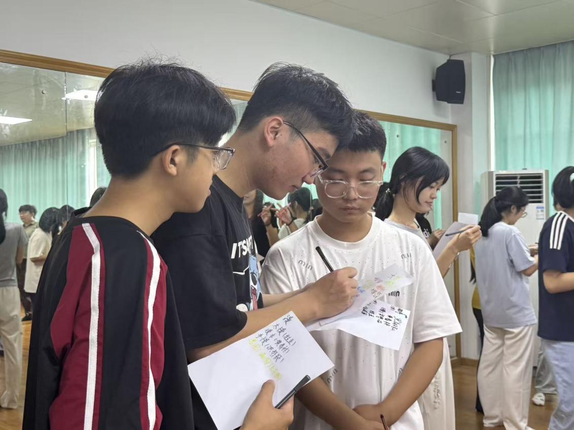 在“入学之旅”阶段,同学们手持清单寻找9位伙伴完成一些系列任务:从最简单的真诚握手、互相揉肩,到需要配合的合作舞蹈造型、分享校园里最满意的角落,再到略显 “走心” 的轻声赞美、交流自己的择友标准。分享环节中,许老师邀请部分同学分享自己的活动感受,并上台重现互动场景,有同学笑着说:“私下被夸和当众被表扬完全不一样,心跳都变快了!”还有同学坦言:“我第一次在这么多人面前唱歌,紧张得声音都抖了,但大家的掌声让我特别感动。”